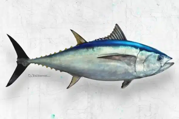 Atlantic Bluefin tuna have a dark back over a silver body with a yellowish dorsal fin and finlets. Bluefin tuna have fairly short pectoral fins relative to other tuna species and can grow to well over 1200 pounds. Bluefin tuna’s popularity as sushi in Japanese markets has led to its steady decline in some regions while still prolific in others. They are found in the Eastern Atlantic Ocean and the Mediterranean Sea. Now considered a separate species from the Pacific bluefin tuna, Thunnus orientalis. Normally these tuna live in offshore waters but often come near shore to feed. These tuna are one of the most sought-after fish by commercial and recreational anglers. Trolling lures and baits, chunking, and live baiting are popular methods to catch these monster tuna.