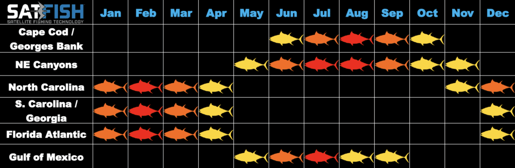 Atlantic bluefin have two main spawning grounds: the Gulf of Mexico and the Mediterranean Sea. Western Atlantic bluefin, the ones commonly encountered off the U.S. East Coast, spawn in the warm waters of the Gulf of Mexico during spring, typically from April to June. After spawning, adult bluefin migrate north along the U.S. East Coast, following cooler waters and abundant bait. From late spring through early fall, they appear off North Carolina, New Jersey, Long Island, and Cape Cod, often staying in the region as long as water temperatures remain favorable and food is abundant. Some bluefin, particularly juveniles and sub-adults, may overwinter farther south or in deeper offshore waters, but many migrate back toward the Gulf in late fall to prepare for the next spawning cycle. Their movements are driven by a mix of water temperature, bait availability, and age-related spawning behavior.