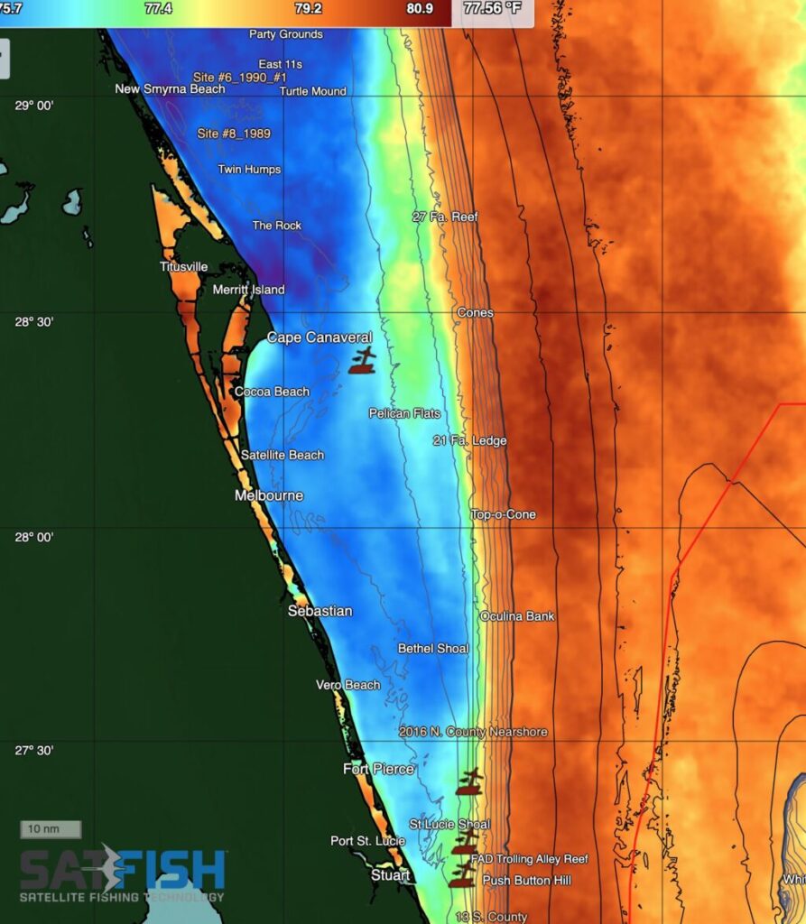 Keep a lookout for frigatebirds, bait balls, jumping sailfish, or slicks on the surface. Sailfish often feed near weed lines, current rips, and along the edges of warm-water eddies. Use SatFish SST charts and current overlays to help pinpoint these productive zones.