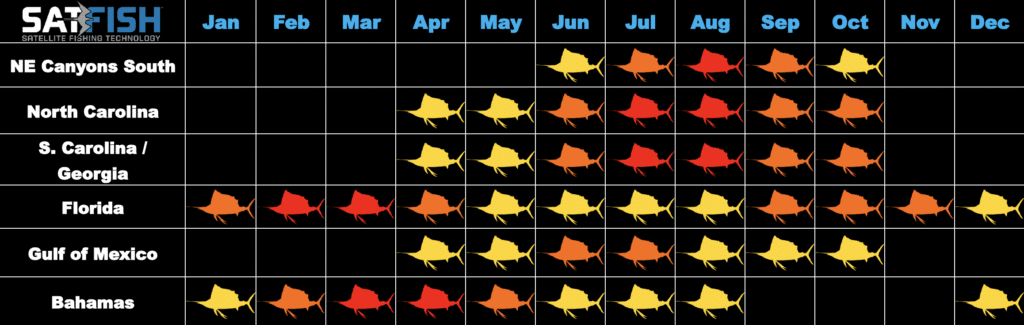 In late spring through early fall, they migrate north along the U.S. East Coast and into the Gulf of Mexico, riding the warm waters of the Gulf Stream. During this time, they’re often found off Florida, the Carolinas, and the northern Gulf, where they feed on schools of sardines, ballyhoo, and squid. As temperatures begin to drop in fall and winter, sailfish move south into the warmer waters of the Caribbean, southern Florida, and the southern Gulf of Mexico, where they remain active throughout the cooler months. This predictable north-south movement gives anglers a reliable seasonal window in each region. Use SatFish SST and current charts to track the warm edges and frontal boundaries sailfish follow during their migration